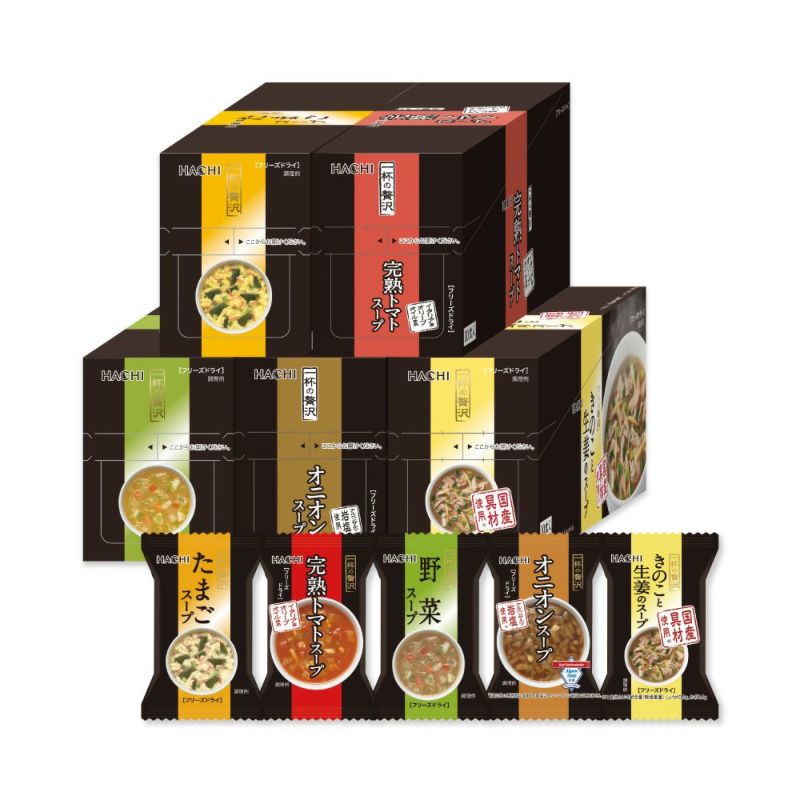 フリーズドライ「一杯の贅沢」シリーズ 定番スープ5品×1箱(50食)のお得なセットです! それぞれの食材の個性をいかして作ったスープのおいしさを、お得な価格で是非お試しください♪